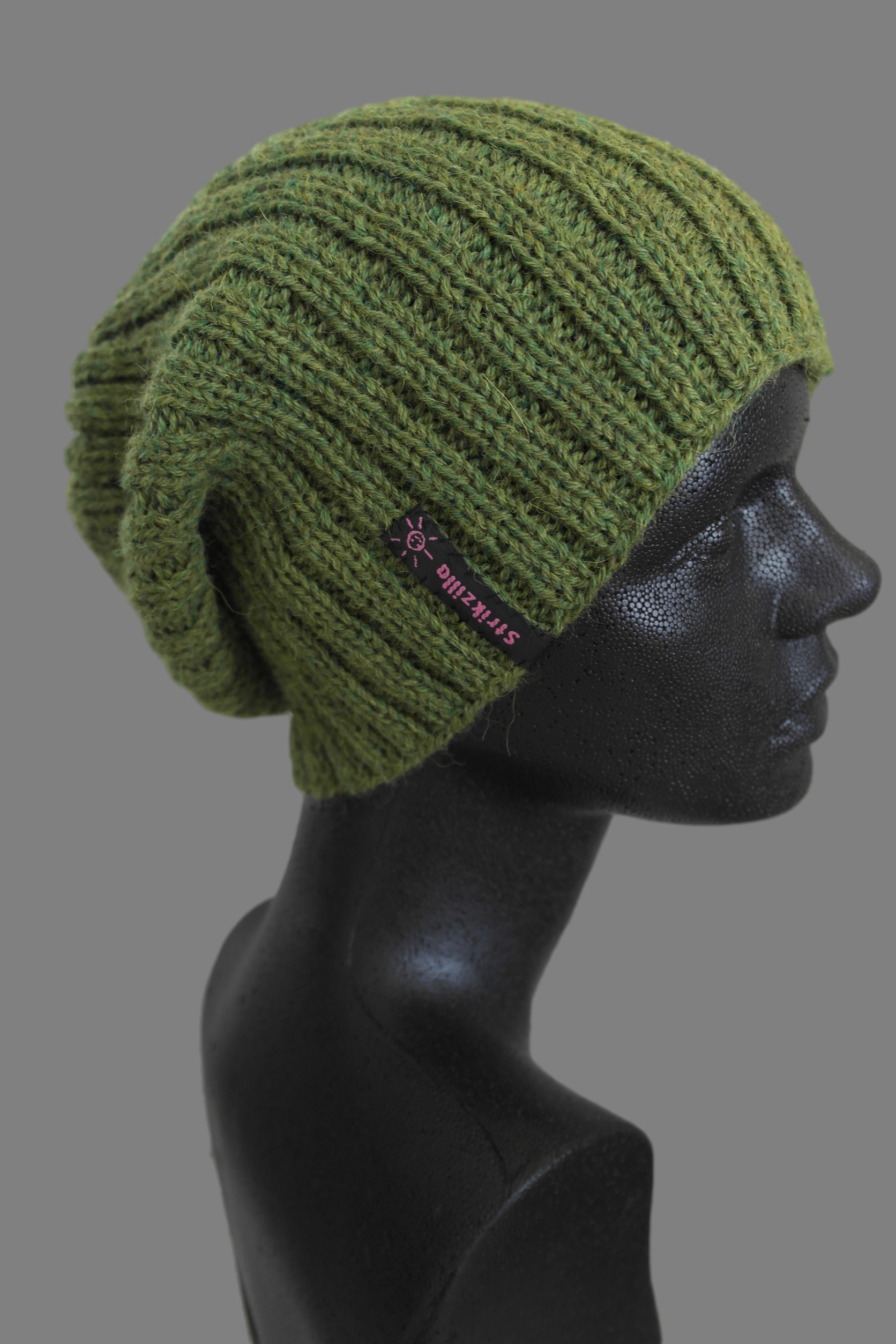 1. Hej Strikzilla. Den olivengrønne hue strikket i rib er den strikket i Drops Alpaca mix med 1 tråd. Altså ikke dobbelt garn. Hilsen Jytte .