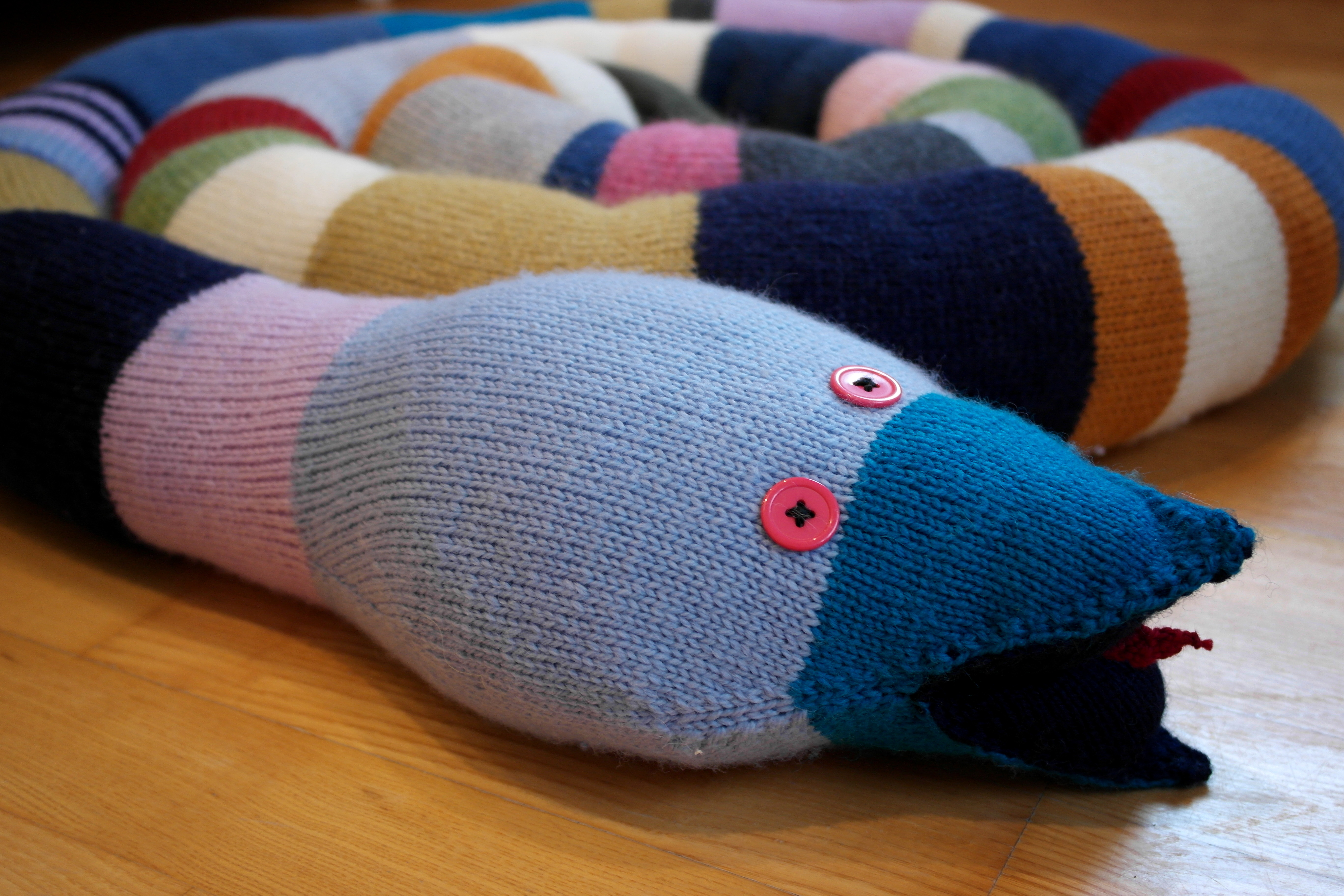 Slangen skal i stedet bruges som sengerand i tremmesengen, så den bliver lidt mindre og den lille pige kan falde glad og tilfreds i søvn der, når den tid kommer 🙂 Jeg tænker at slangen også kan bruges som legetøj, en ekstra pude eller bare som pynt på børneværelset.