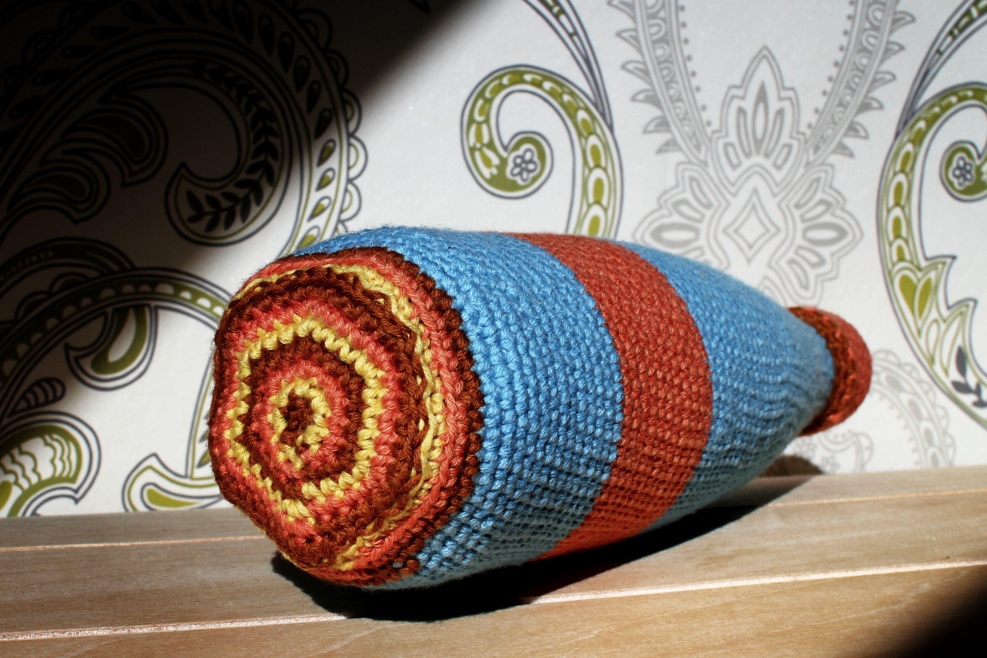Jeg har også hæklet et betræk til en vandflaske, som er fyldt med tørrede bønner og lidt ris. Babyen synes sådan en flaske er vildt sjov, dog var hun ikke lige begejstret for det hæklede betræk… Flasken er hæklet efter mit eget hovede og jeg var glad (og overrasket) da det viste sig, at det passede perfekt! Bunden hæklede jeg for sig og syede den fast mens betrækket var på flasken. Og med flasken er også de sidste rester fra Kuraffen opbrugt 🙂