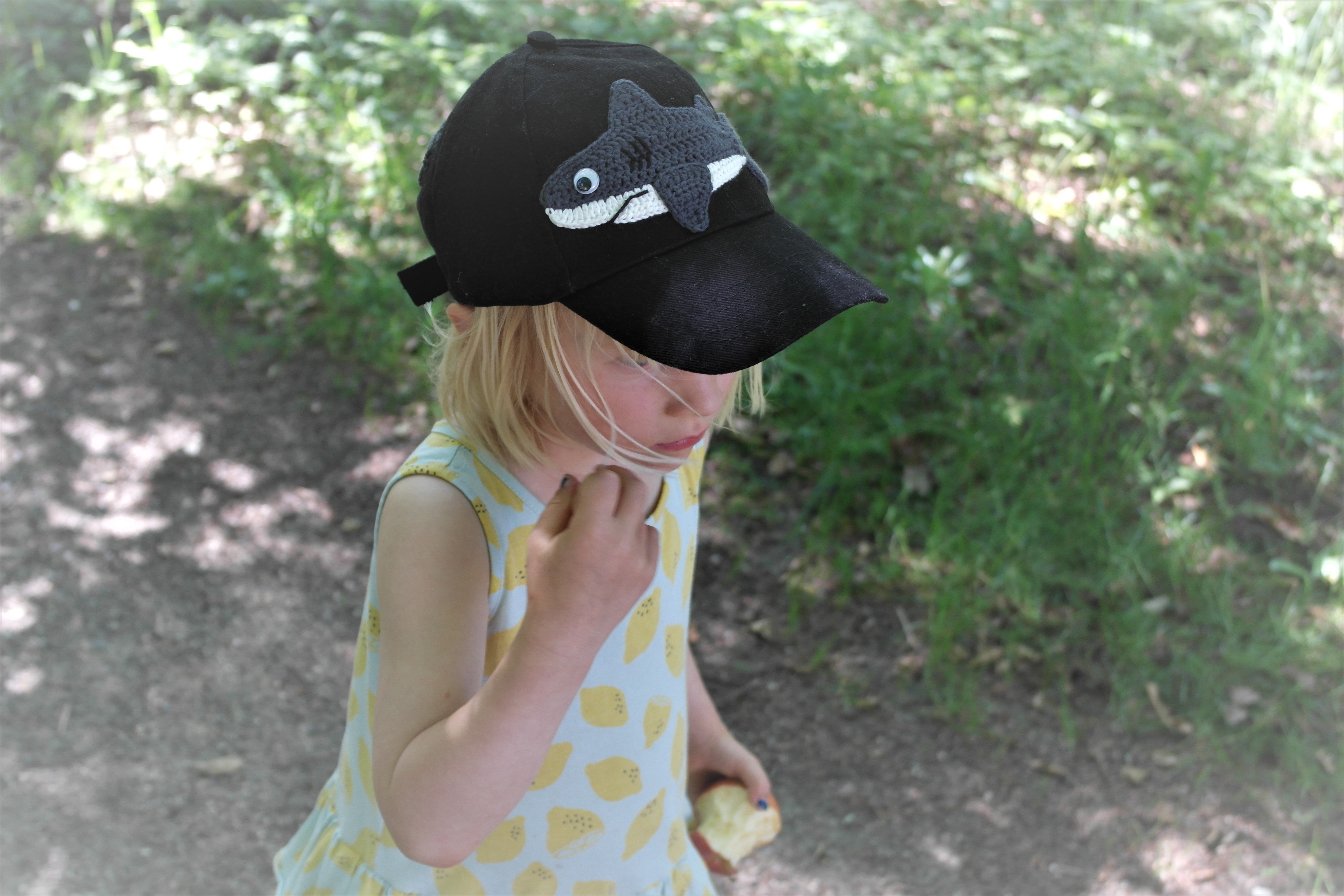 For nogle uger siden fik jeg den sorte kasket, som skygger udmærket for solen, men ellers var relativ kedelig. Jeg ville derfor gøre den lidt sjovere og efter rådføring med 4-åringen blev vi enige om at den skulle pyntes med en haj.