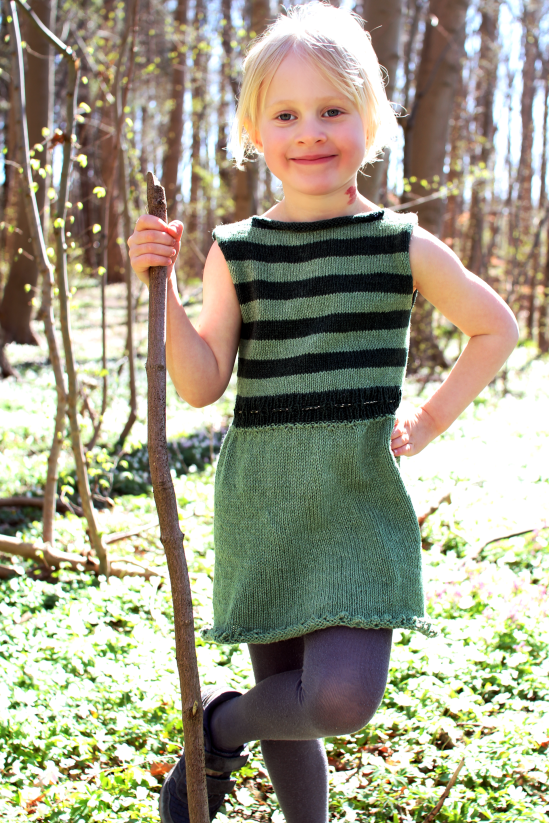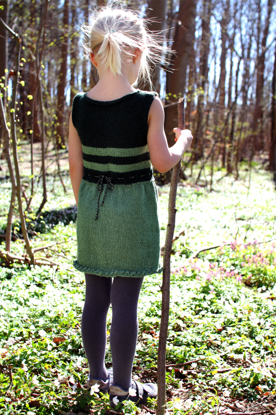 Kjolen blev til mens jeg strikkede og jeg hverken målte eller beregnede noget som helst – ret befriende for en som normalt planlægger ned i mindste detalje. Heldigvis havde jeg kjolens modtager lige ved hånden og kunne prøve den på undervejs (til 5-åringens store frustration).