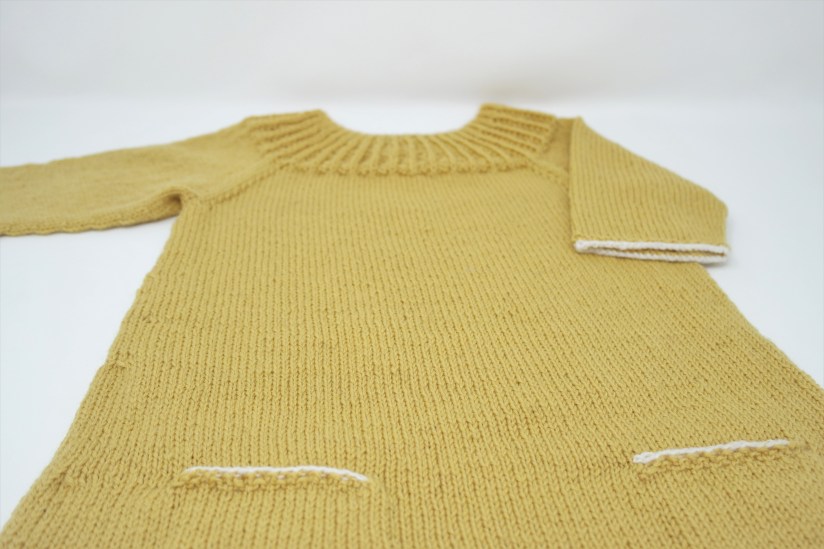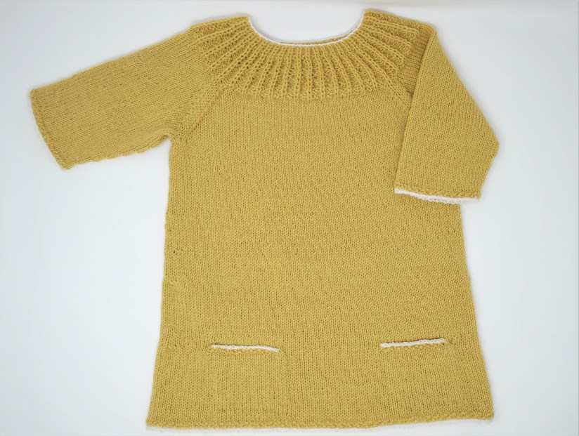Tunikaen er strikket i farven 2117 gul og hvid til kanterne og jeg har brugt pinde nr. 3.5. Jeg er helt vild med kjolen og specielt den lille detalje med de to små lommer. De var dog lidt besværlige at arbejde med, men det lykkedes nu rimelig godt til sidst.