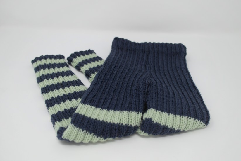 Tightsen er strikket i farverne gråblå (fra Molinerkoften) og 9022 støvet lysgrøn. Tightsen er enkel at strikke, dog går det lidt langsommeliget med al den rib. Jeg har brugt pinde nr. 3.0 og 3.5.