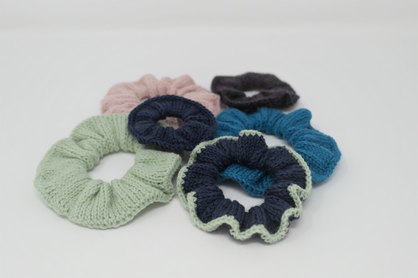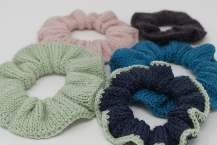 Scrunchiene er virkelig nemme at strikke. Jeg har taget udgangspunkt i denne opskrift fra Drops Design og brugt restegarn, primært Sisu fra Sandnesgarn. Scrunchiene strikkes rundt på en lille rundpind og hækles sammen til sidst med fastmasker. Størrelsen ændres ved enten at lægge færre masker op (lille blå i midten af billedet) eller ved at strikke kortere (blå med lysgrøn kant).