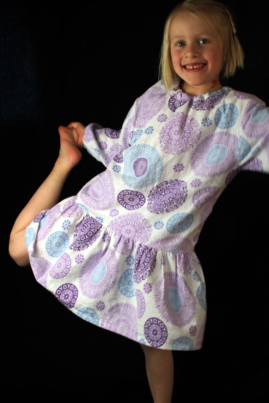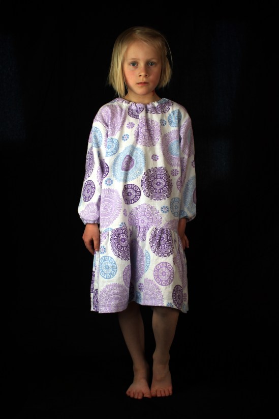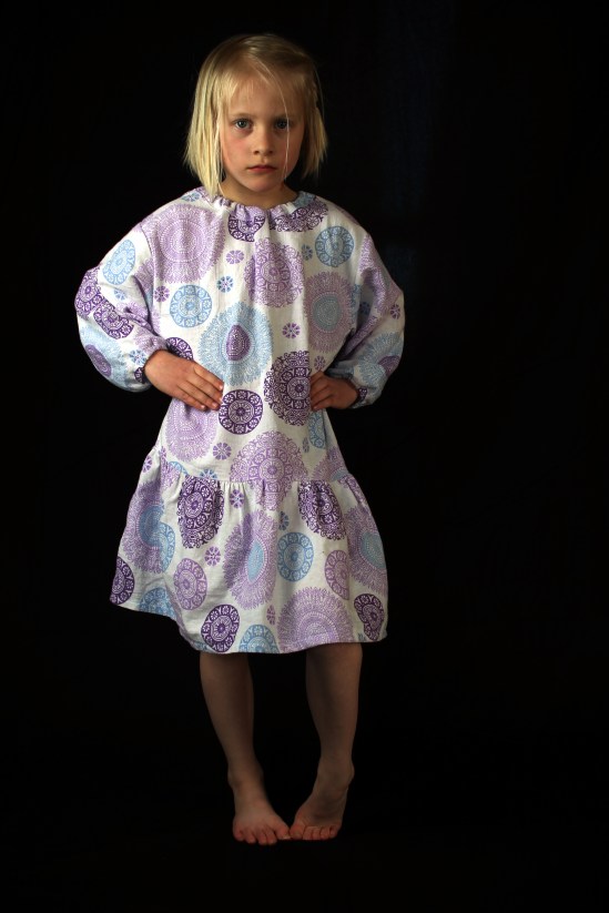 For at gøre halsen mindre dyb syede jeg en ret stor kant og trak en elastik igennom. Ermene var alt for lange og brede så der klippede jeg et godt stykke af længden og lavede også en kant med elastik i. Til sidst var både jeg og 6-åringen strålende tilfredse og hun har flere gange omtalt kjolen som “min elskede kjole”.