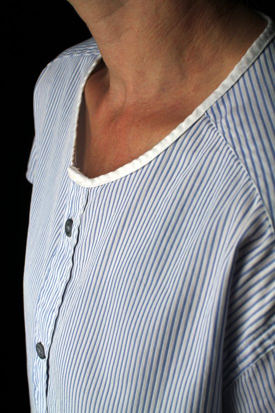Redesign af herreskjorter er meget populært, og efter mit første forsøg kan jeg godt forstå hvorfor. Herreskjorter er ofte syet i lækkert stof med pene detaljer og jeg har efterhånden set mange pæne, nærmest ubrugte eksemplarer i genbrugsbutikkerne. Jeg var så heldig, at manden ryddede ud i sit klædeskab og jeg kunne overtage hele 4 skjorter han ikke længere brugte. De var alle sammen i god stand og helt klare til at leve videre som en t-shirt, en kjole, eller noget helt andet. Den ene skjorte blev forvandlet til en let oversized t-shirt – og jeg elsker den!