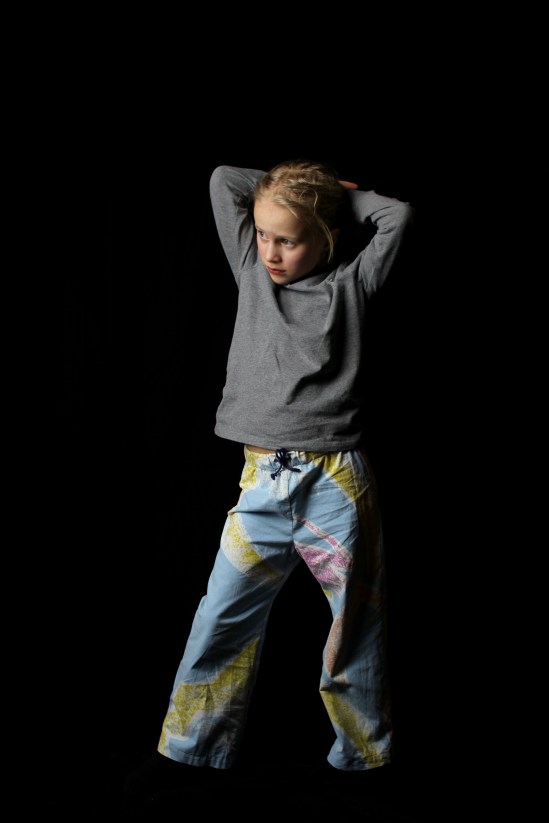 Buksen her er syet efter samme mønster som jule-buksen og stoffet er resterne af sengetøjet som jeg brugte til denne kjole. Noget af det som tager lang tid med at sy (og som er ret kedeligt) er at tegne og klippe mønsterdelene. Så når jeg først har tegnet et mønster, kan jeg godt lide at bruge det flere gange. Specielt hvis både jeg og modtager er tilfredse med resultatet. Og det er vi helt sikkert med dette mønster.