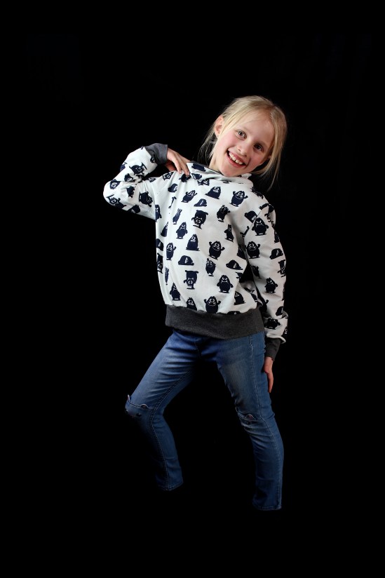 Alvilde er nu klar til at erobre verden iført sin nye Monster-sweater, og jeg er meget glad for at hun stadig gerne vil bruge mit hjemmesyede tøj.